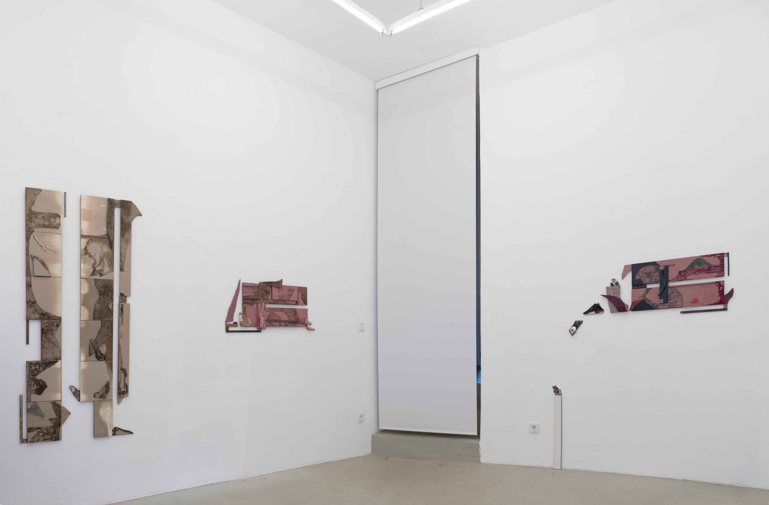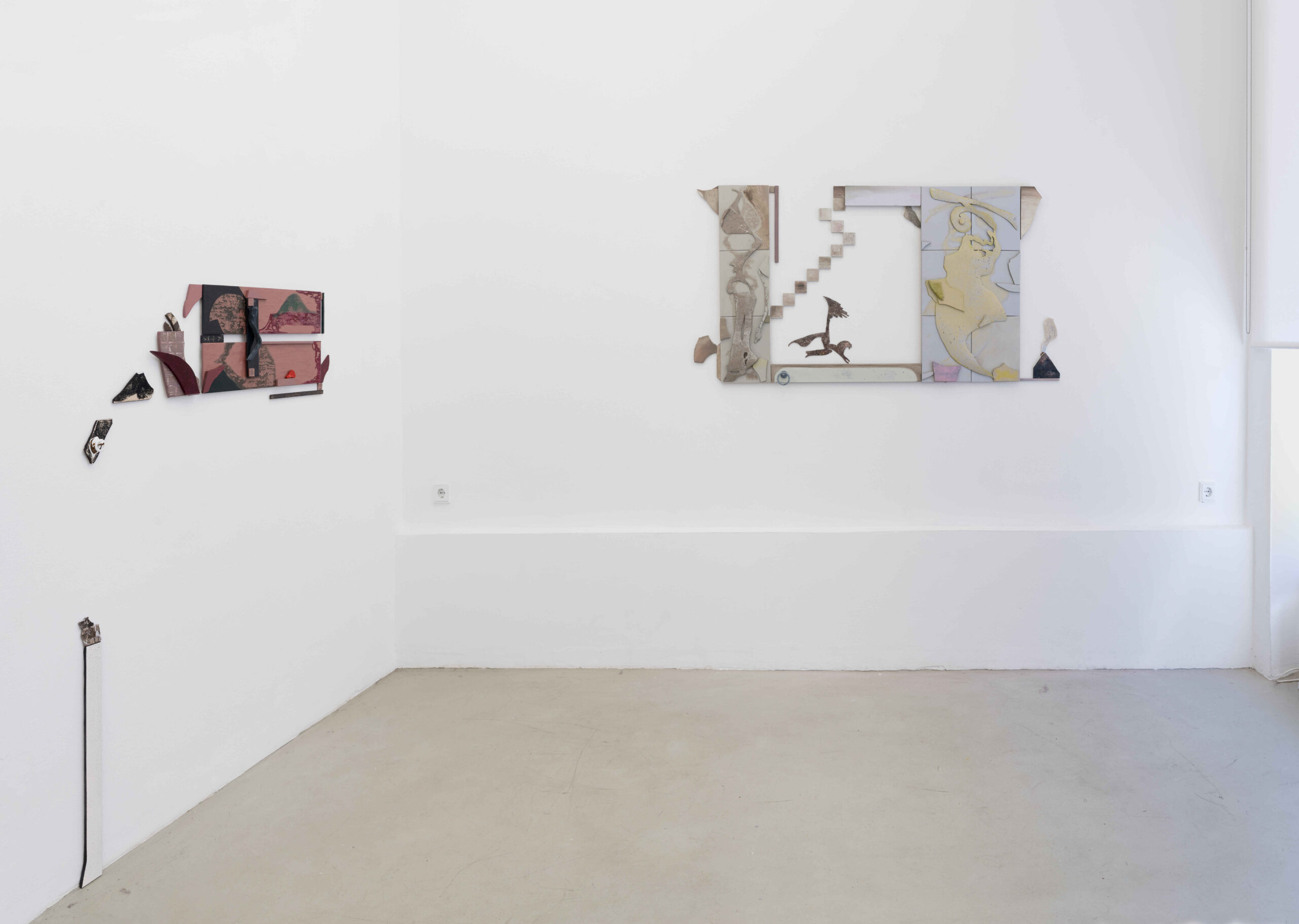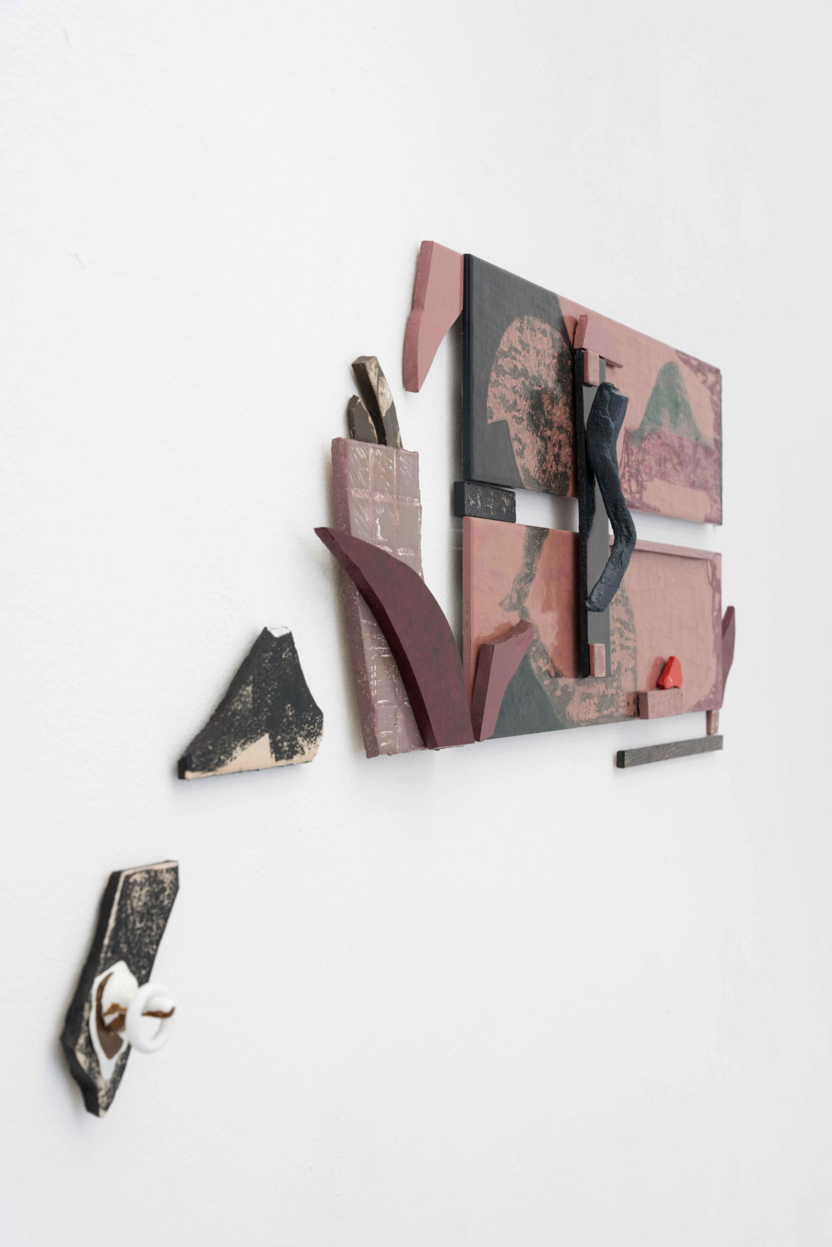Angesammelt und aufgestapelt ruhendes Material längst vergangener Leben. Aus diesem Archiv schöpfend wachsen im Nebeneinander und Übereinander Gebilde aus unterschiedlichen Materialien, die sich neu angeordnet von Tag zu Tag verändern, bis sie letztlich in ihrer Endgültigkeit münden. In der Ausstellung mit dem Titel „walnut as thick as my neck“ sind collagierte Wandinstallationen zu sehen, die sich zwischen Malerei und Objekt bewegen.