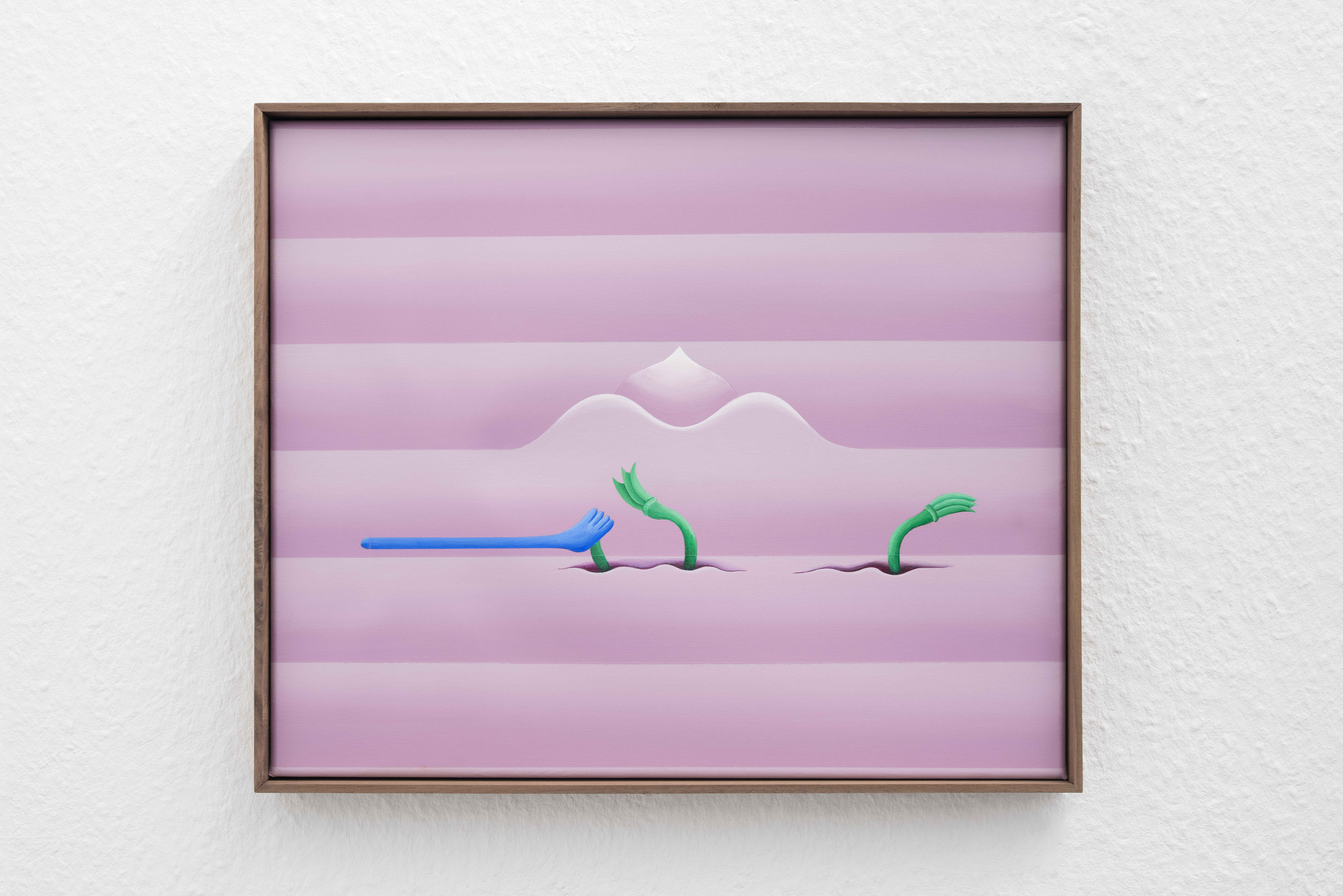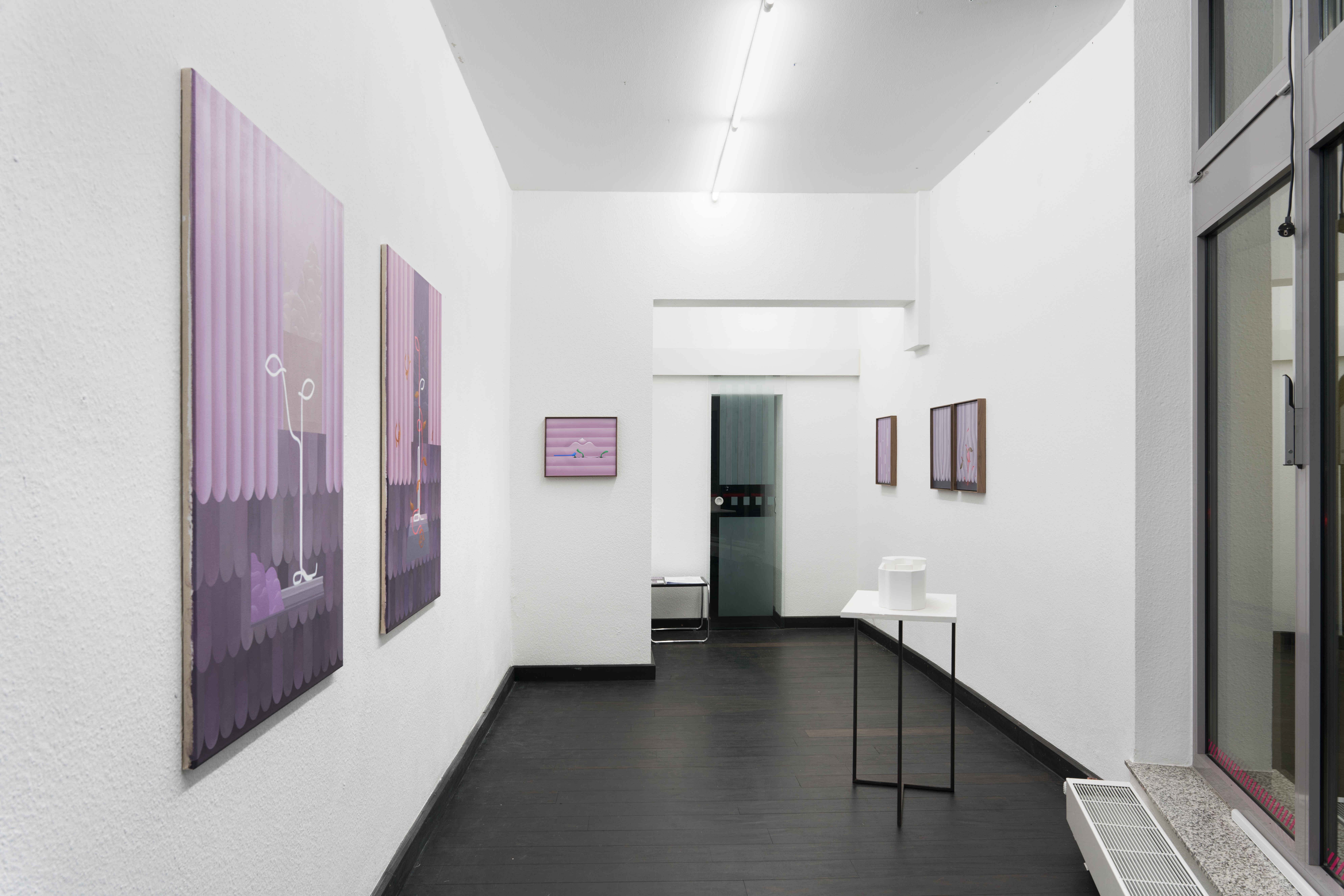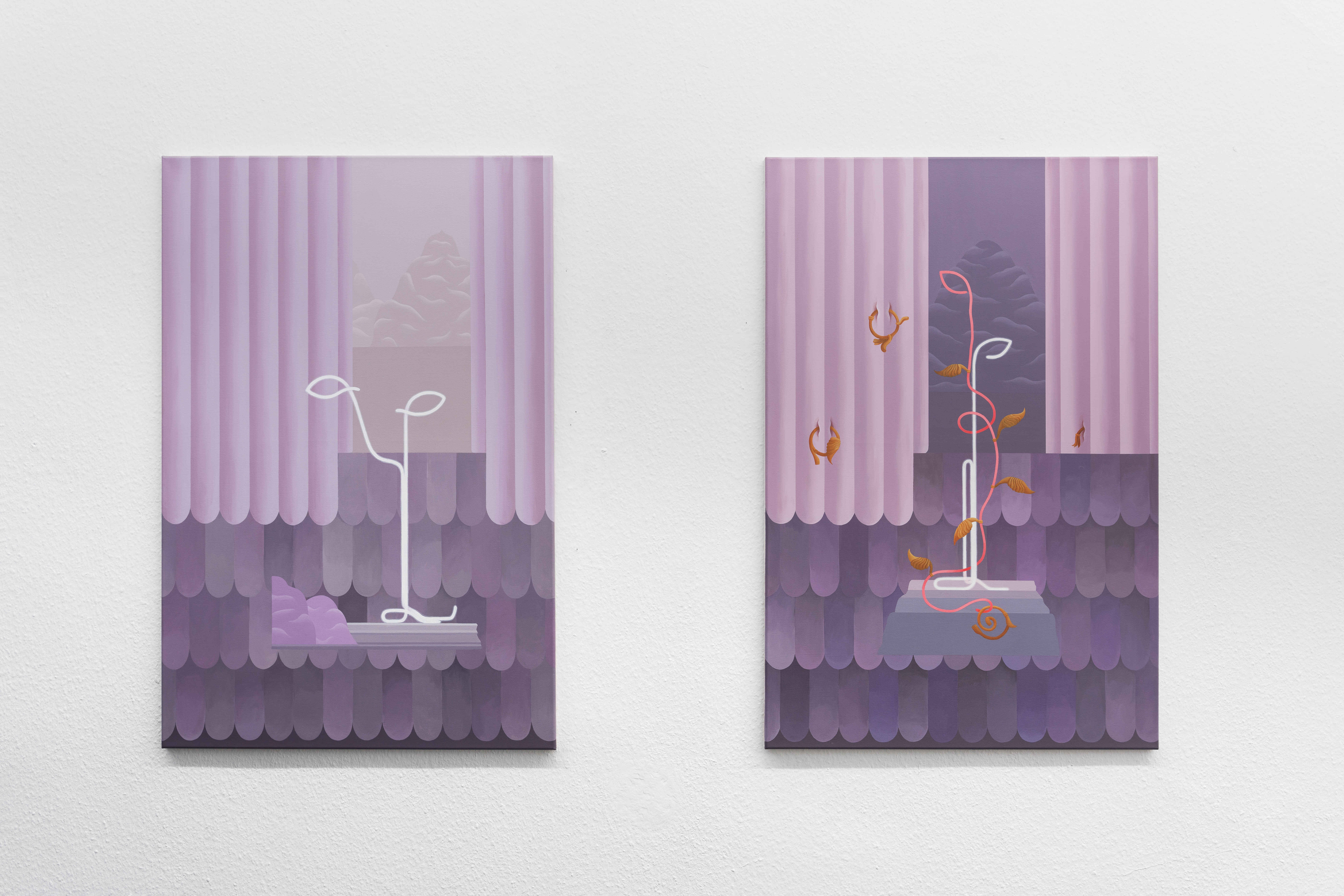 In “Curtains and Wounds” series, skin color takes on additional meaning. In contrast to the figurative nature of the “Armor” series, this series is characterized by scenes that look like landscapes that deviate the viewer’s perception and orientation as it is not clear whether it is painted from an exterior or interior point of view. These are imaginary landscapes that combine different motifs like curtains, ountains, decorative and ornamental elements, and various shoeing. The color tones of the paintings are made of different shades of human skin, it is a juxtaposition that seeks to sharpen a sense of contrast between the eroticism, beauty, and seduction of the paintings, with a disturbing and enigmatic scenery of something strangely familiar and alienated at the same time, that leads to a threatening atmosphere in which the organic traces are blending with the inanimate
