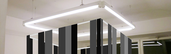 Die ortspezifische Installation „Verbrauchen“ befindet sich im Hauptausstellungsraum. Sie besteht aus einer schwarzen Hängekonstruktion aus Nylonstoff, der überwiegend für so genannte Outdoor-Materialien verwendet wird. Die Arbeit ist an der quadratischen Neonröhrenkonstruktion unter der Decke befestigt und hängt bis kurz über den Boden herunter, wobei vereinzelte Stoffbahnen am unteren Ende von schwarzen Seilen zusammengezogen werden. Die schlichte geometrische Formgebung der Installation erinnert an Strukturen industrieller Architektur, wie z.B. an die Konstruktion eines Schachtes. Durch die genaue Positionierung unter den Neonröhren und der Wahl des schwarzen Stoffs, geht die Arbeit auch auf die Thematik des Kunstlichtes ein, als eine Errungenschaft der Moderne und Beschleuniger des industriellen Lebens.