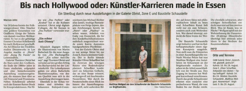 Für meine Ausstellung in der Baustelle Schaustelle möchte ich eine raumspezifische Installation erstellen, in der Zeichnungen und Skulpturen kombiniert werden. Meine Arbeit reflektiert den geschichtlichen Kontext Essens, vor allem der Waffen- und Eisenindustrie und der Architektur der Kohleindustrie. Diese Ausstellung führt meine künstlerische Tätigkeit der letzten Jahre weiter. Groteske Kriegs– und Horrorszenarien werden mit Hilfe von animierten Figuren dargestellt, die kindlich anmuten und spielzeugähnlich in makaberen und zugleich kühlen Kulissen von Krieg und Zerstörung erscheinen. Im Projektraum werde ich ein Modell einer abstrahierten Kanone zeigen, die mit Plüsch überzogen ist.…