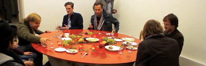 Martin Kleppe konstruierte für seine Ausstellung in der BaustelleSchaustelle einen Tisch aus Textilbeton und Holz. Der Ausstellungstitel ” ein Abend Essen” wurde wörtlich genommen und Martin Kleppe servierte zusammen mit seiner Familie ein üppiges Mal.