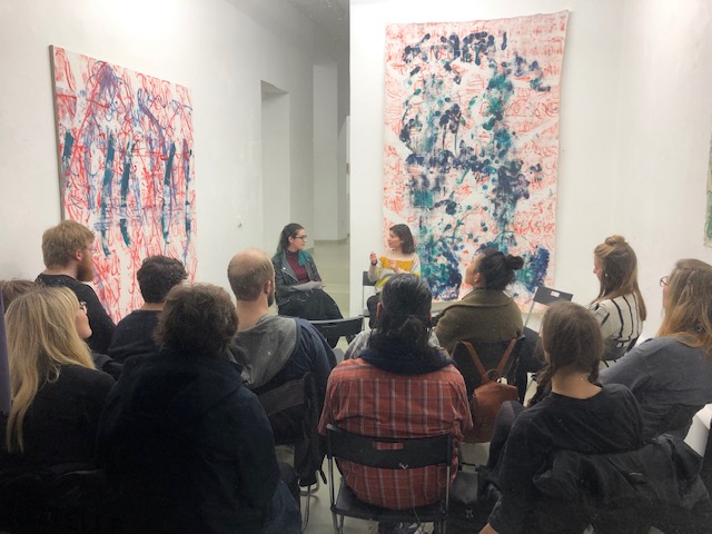 “Ich male überall im Raum; an der Wand, auf dem Fußboden, auf Tischen oder Stühlen stehend. Das Atelier ist für mich ein Nest aus Materialien aus dem sich neue Bildideen formulieren können. Als Atelierkünstlerin sind meine Werkzeuge oftmals das, was ich in meinem Atelier vorfinde. In letzter Zeit vor allem Küchenschwämme, Ölfarbe, Leinwandstoff und mich selbst. Mich interessiert, dass sich meine physische Präsenz ganz unmittelbar in das Bild einschreibt. Daraus eröffnet sich ein Spektrum bezüglich der Größenverhältnisse: Die Leinwand im Verhältnis zur Größe des Schwamms und zum Umfang meines Körperradius. Die eine Konsequenz dieser Entdeckung ist dass ich durch ein sehr großes Format der Leinwand meinen eigenen Körper vergrößern kann. Die andere Konsequenz ist die, dass ich nicht mehr male, was ich sehe, sondern wie ich mich bewege.”