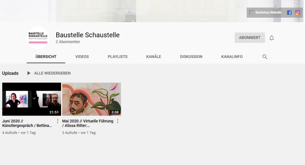 So sieht er aus — unser neuer YouTube-Kanal, auf dem wir in Zukunft regelmäßig ZU GAST Beiträge wie Gespräche oder virtuelle Ausstellungsrundgänge veröffentlichen werden. Aktuell ist dort die virtuelle Führung durch Alissa Ritters “Erinnerungsgeflechte” sowie ein Gespräch der Künstlerinnen Bettina Sellmann und Julia Jansen bzgl. ihrer Aussellung “easymagic123” zu sehen.